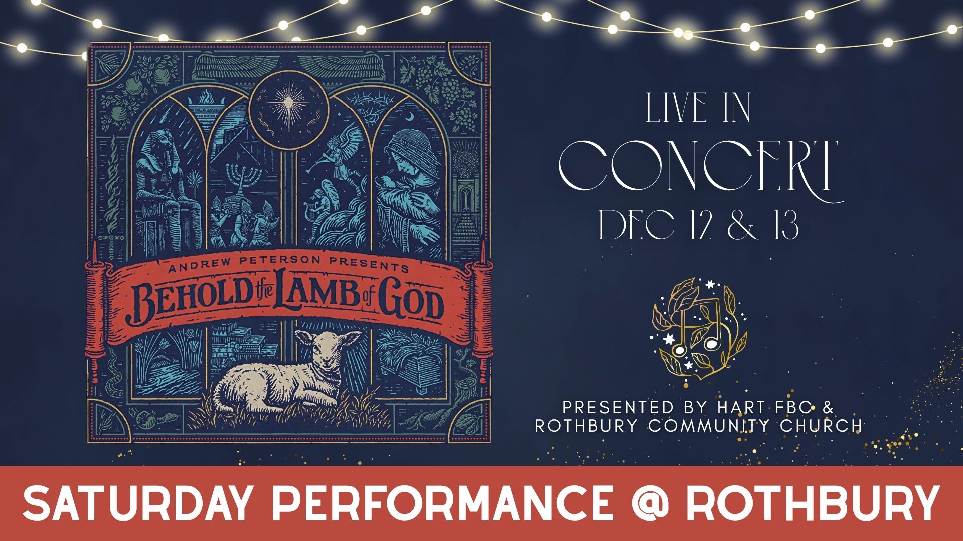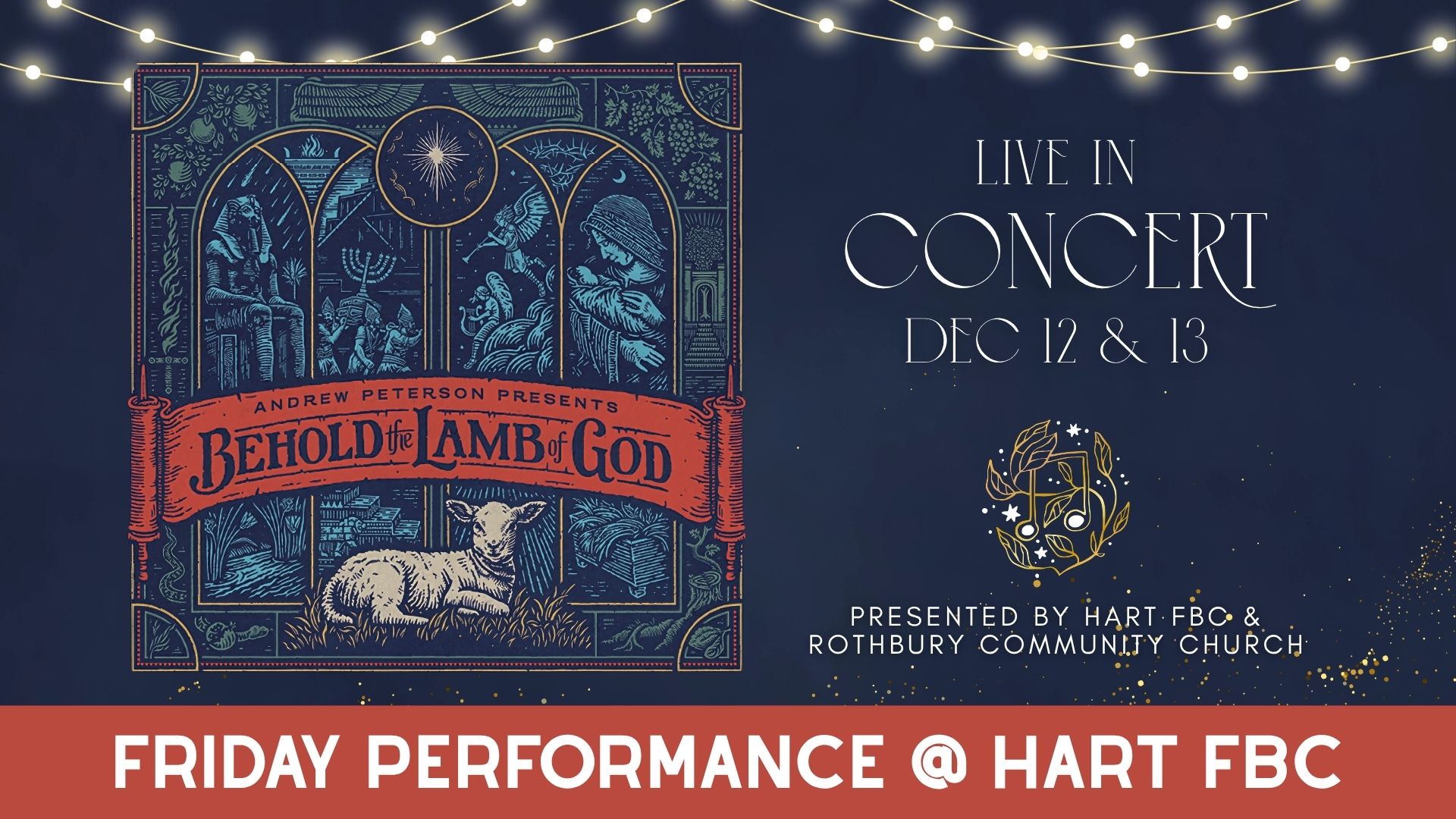 This December, join us for a special evening of worship as the FBC and Rothbury Community Church Worship Ministries present Behold the Lamb of God by Andrew Peterson. This beautiful, Scripture-rich musical tells the sweeping story of Christ’s coming—from the Passover to the manger—through powerful songs, rich with biblical imagery.
